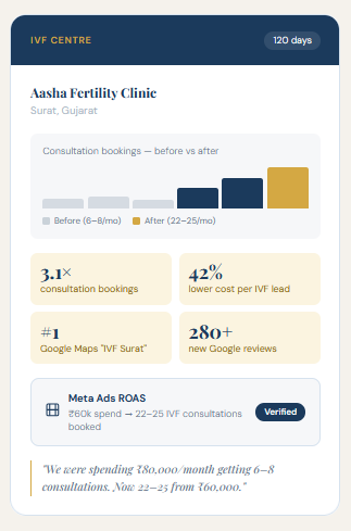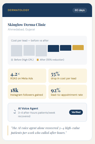 ClinicScaleOS is designed for specialist clinics generating ₹15L+ monthly revenue and spending ₹50,000 or more on advertising. We work primarily with Orthopedic, IVF, Dermatology, Cosmetology and Physiotherapy clinics — and multi-specialty hospitals — across India, with our strongest local presence in Ahmedabad and Gujarat.
